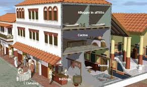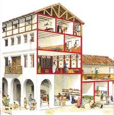 · Insula: bloque de viviendas de alquiler donde vivía la plebe. Se trataba de viviendas sin patio ni agua corriente y algunas podían alcanzar los siete pisos. Los más ricos ocupaban los pisos inferiores; y los pobres, los superiores. A ras de suelo estaban las tabernae (tiendas).